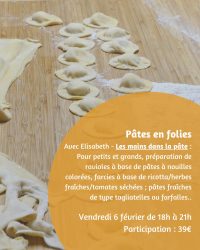 Atelier pour petits et grands : préparation de ravioles à base de pâtes à nouilles colorées, farcies à base de ricotta/herbes fraîches/tomates séchées ; pâtes fraîches de type tagliatelles ou farfalles. Et chacun emporte un assortiment des préparations réalisées. Inscriptions et renseignements directement au magasin du Moulin, au 03.88.70.01.67 ou par mail à moulin@burggraf-becker.fr.