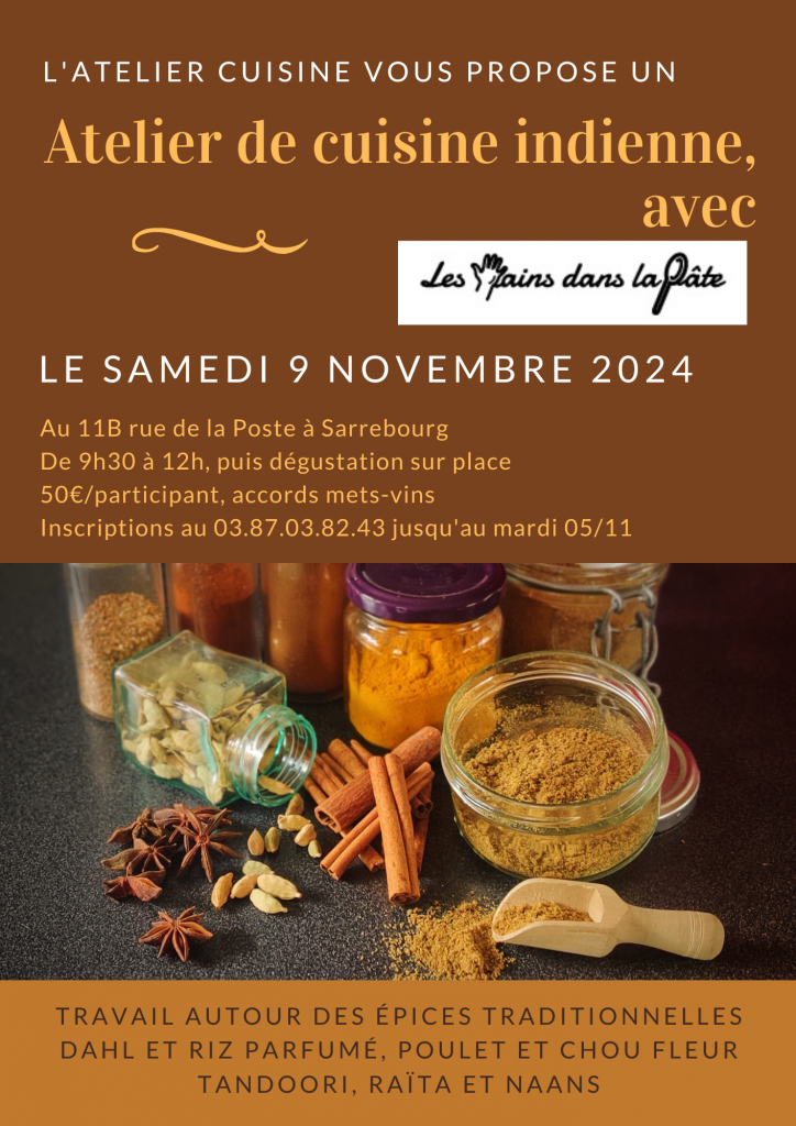 | Travail autour des épices traditionnelles – Réalisation d’un dahl et de riz parfumé, poulet et chou-fleur façon tandoori, raïta et naans. Atelier suivi de la dégustation partagée. |