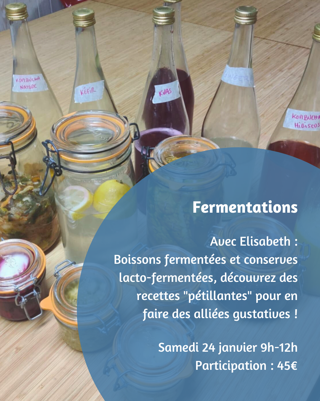 Et repartez avec un assortiment des préparations réalisées. Dégustation de boissons pétillantes naturelles à l’issue.